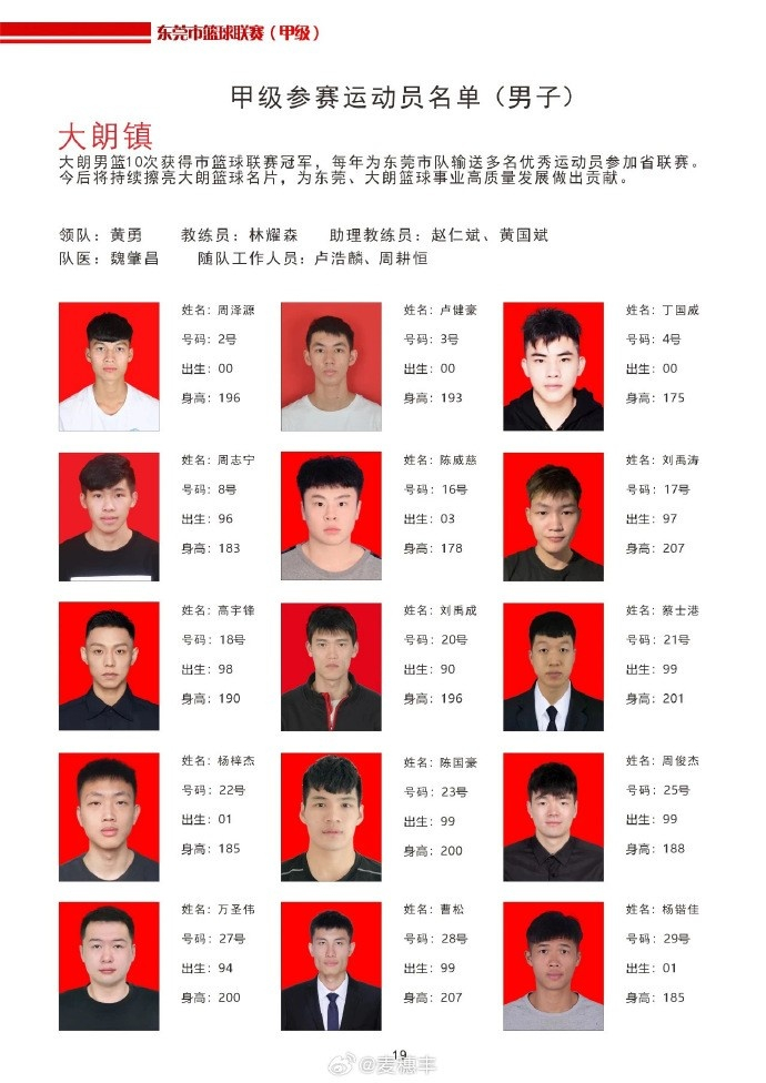 可以看到,大朗镇队除了有广工名将高宇锋、卢健豪外,还有北控状元陈国豪、前CBA球员万圣伟等悍将。