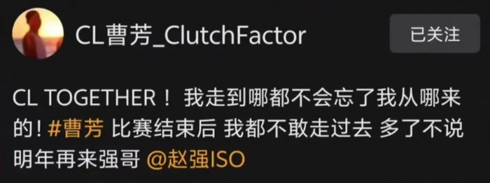 瓷器厂球员曹芳也直言怕自己控制不住情绪,赛后不敢走过去打招呼,而是通过社交媒体的形式向赵强送上了最好的祝福:「明年再来强哥。」