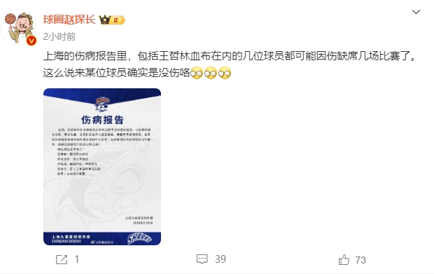 媒体人赵探长转发了这则伤病报告并配文写道:“上海的伤病报告里,包括王哲林血布在内的几位球员都可能因伤缺席几场比赛了。这么说来某位球员确实是没伤咯。”