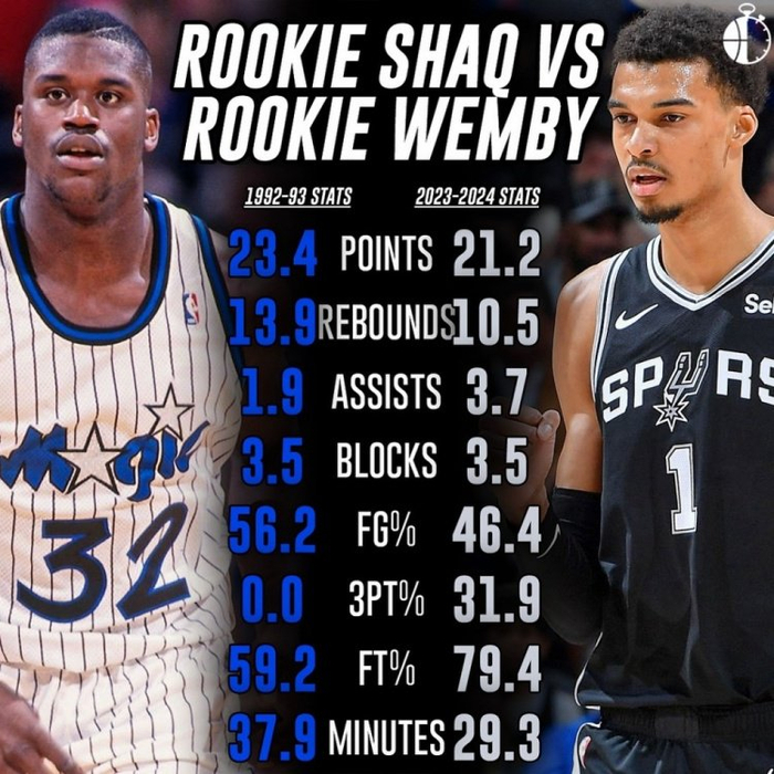 会投篮的鲨鱼!文班与奥尼尔菜鸟季数据对比:分板略差 远投出色