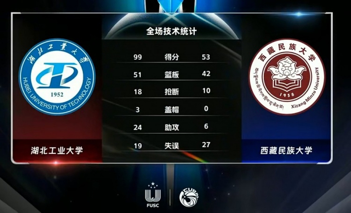 湖北工业大学:胡景源18分10篮板3助攻5抢断、白贺21分5篮板6抢断、刘子涵9分10篮板、粟力德16分5篮板2助攻;巴谡7分2篮板5助攻、梁米一7分4篮板。