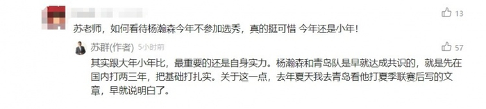 有球迷向篮球评论员苏群询问道:“苏老师,如何看待杨瀚森今年不参加选秀,真的挺可惜,今年还是小年!”