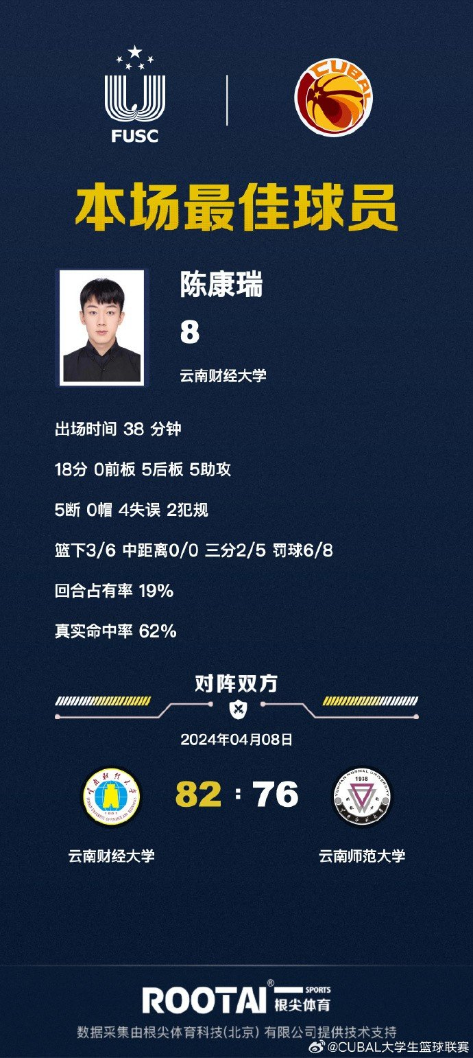 云南财大:黄海洋20分13篮板、陈康瑞18分5篮板5助攻、张天培17分7篮板、胡明宇12分6助攻、杨柯8分4篮板、杨建4分6篮板、鲍鑫洋3分4篮板。