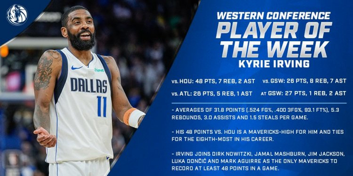 欧文上周场均可砍下31.8分5.3篮板3.0助攻1.5抢断,命中率高达52.4%,独行侠取得3胜1负战绩。