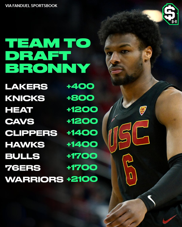 直播吧04月12日讯 布朗尼-詹姆斯宣布参加2024年NBA选秀后,博彩公司顺势开出了球队选中布朗尼的赔率。