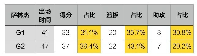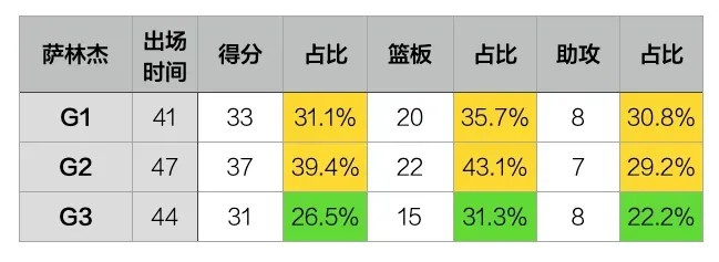事情在G3悄悄发生了变化,虽然萨林杰还是体能拉满打了44分钟,可是他的31分只占全队总得分的26.5%,15个篮板只占全队的31.3%,8次助攻也只是球队总助攻的22.2%而已。
