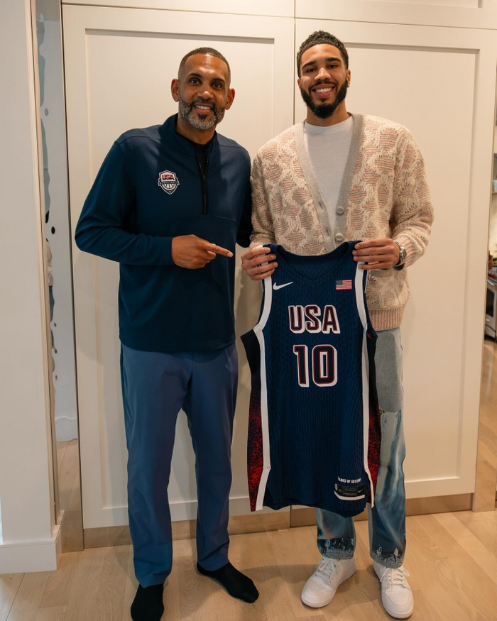 美国男篮总经理格兰特-希尔为塔图姆和霍勒迪送来美国队球衣