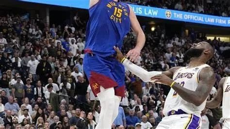 第二节湖人一度领先9分,勒布朗掩护犯规,然后被约基奇夹击抄掉,掘金追上。