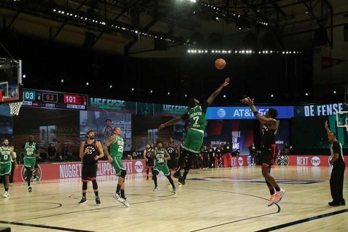 2020年9月4日,东部半决赛G3,猛龙104-103凯尔特人,阿努诺比底角接球后极限三分出手,命中绝杀。