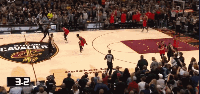 2018年5月6日,东部半决赛G3,骑士105-103猛龙,詹姆斯后场推进一条龙,打板抛投绝杀。
