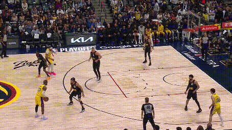 另一件跟波普有关的事情是,掘金的对位更改。这场比赛,浓眉抛投、持球投中距离炸裂,上半场大量惩罚了约基奇的单防。拉塞尔也能进定点和持球投三分了。更狠的是,第三节开局,詹眉双剑合璧打起了挡拆,掘金中路被连续打穿,约基奇的防守有点招架不住了。