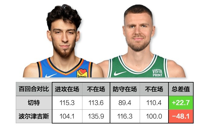 而切特这个数字是+22.7,当他在场球队每百回合净胜25.9分,反之净胜3.2分。其中防守端,切特在场,雷霆每百回合可以少丢21分......