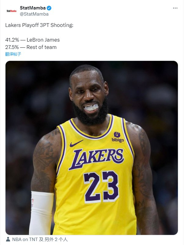 湖人今年季后赛三分命中率:詹姆斯41.2%,其他人27.5%。