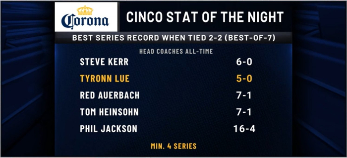 据统计,这是泰伦-卢担任主帅时首次天王山之战输球。此前5次他都取得了获胜,在NBA历史上仅次于科尔的6战全胜。