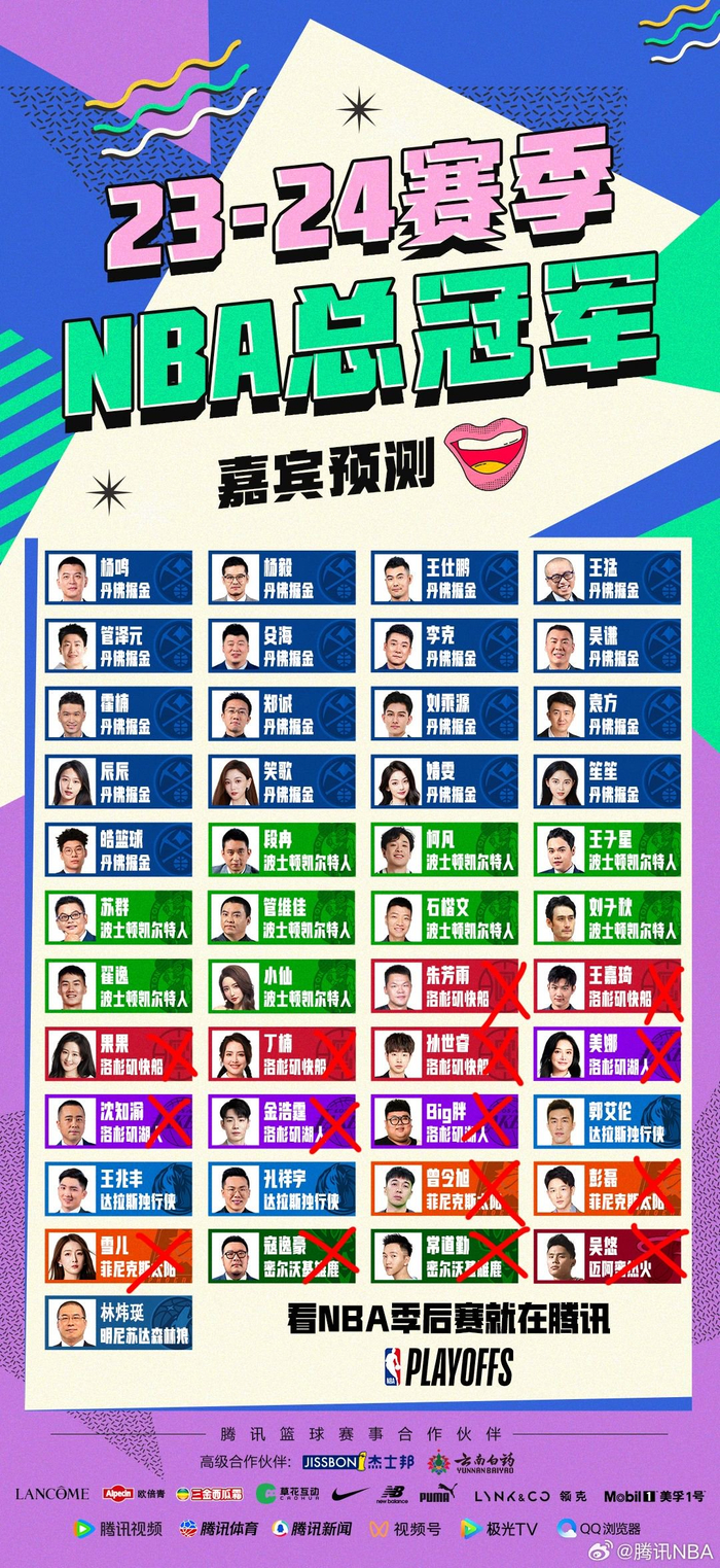 2024年NBA季后赛正在火热进行中,鹅厂的嘉宾在季后赛开始前,再次进行了季后赛预测。