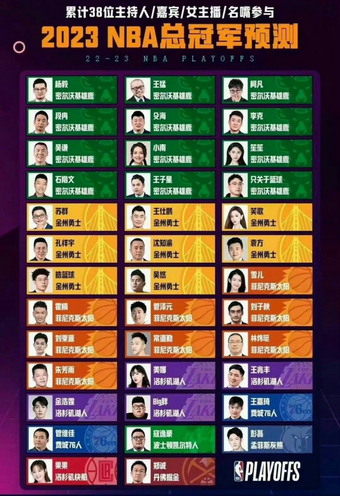 值得一提的是,上赛季鹅厂38位主持人、嘉宾、女主播、名嘴的季后赛预测,仅1人预测正确。