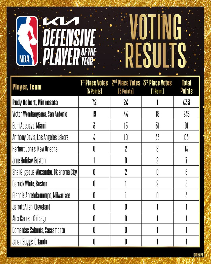 DPOY票型:文班第二 浓眉第四 卡鲁索小萨小白等人收获投票