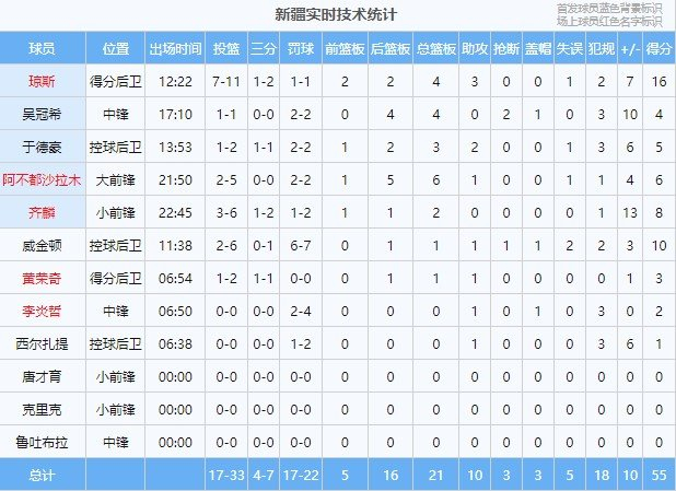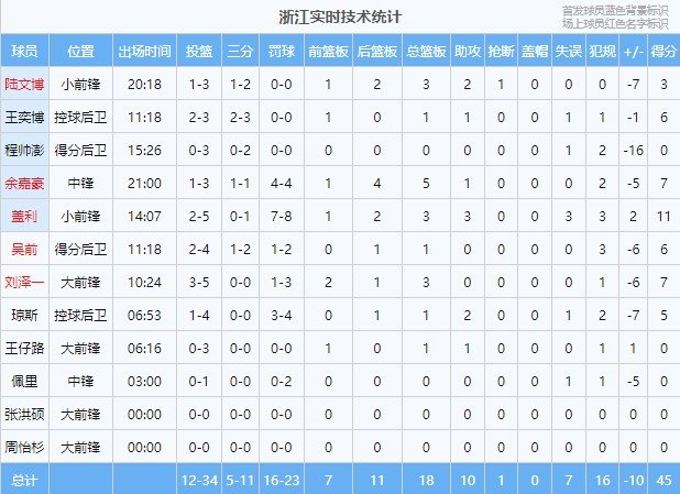 浙江外援盖利半场8罚7中,新疆外援威金顿7罚6中。