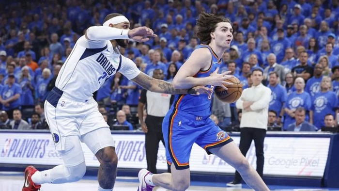 但我的感受是,东契奇的伤病影响依然没有消除。基德对此的调整是,适当给东契奇减了负,这首先体现在欧文扮演控卫的职能更多,欧文也完成得不错。另外,独行侠开局先找PJ-华盛顿低位去坐SGA,这看起来不可能是常用打法,但丰富起手式不是坏事,也有一些效果。第四节,华盛顿又一次在低位吃掉SGA,在很关键的时段打了雷霆措手不及。这组对位有过成功尝试之后,估计后续独行侠会时不时拿出来消耗SGA。