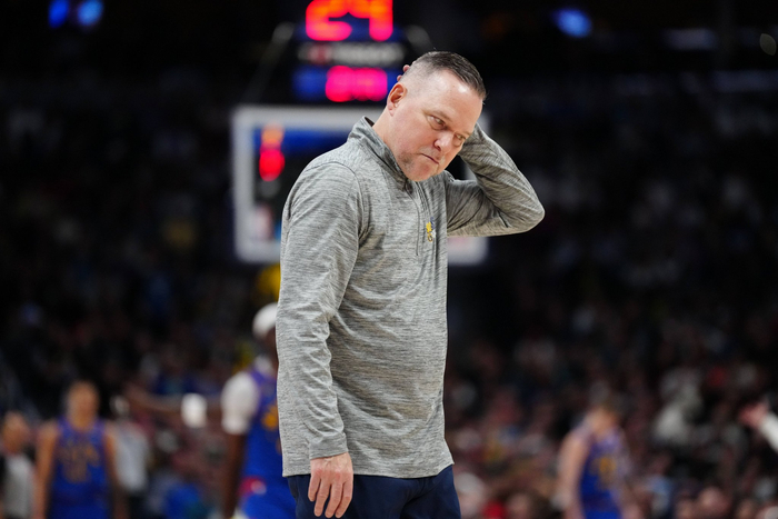 无法单防华子以及约老师防挡拆天然吃亏始终是掘金在系列赛客观真实存在的防守难题,马龙破釜沉舟,放空弱侧底角的麦克丹尼尔斯/麦克劳林,利用戈贝尔/李凯尔在场上吃空间的特点,不惜一切代价往华子脸上堆人。掘金强侧夹击,弱侧轮转,冒着被三分投死的风险,也要拿走森林狼强点的禁区平推攻势。
