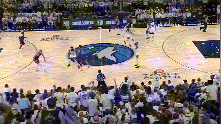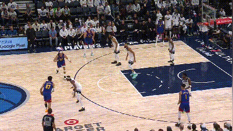实际情况是,戈贝尔不在的时段,森林狼的进攻同样难打。G2李凯尔打进攻端事实上的5号位时段,这个点打出了追梦的效果。于是,G3掘金给了他同样的弧顶天王待遇,其他人并没有跑出太漂亮的无球,也没有围绕李凯尔手递手掩护做更多文章。