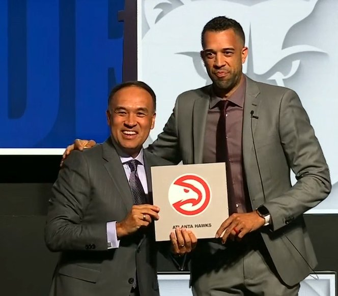 直播吧05月13日讯 2024年NBA乐透抽签仪式在芝加哥进行,老鹰总经理菲尔兹代表球队抽中了状元签。