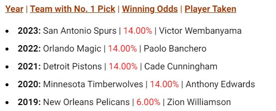 老鹰以3%的概率抽到了状元签,这是2019年现行乐透规则执行以来,抽中状元签概率最低的一次。之前最低的一次是2019年鹈鹕的6%,之后连续4年状元签都由拥有最高14%概率的球队抽走。