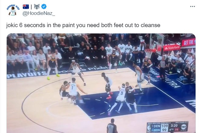 第四节3分多钟时,约基奇在禁区内妙传戈登扣停森林狼,有森林狼博主抱怨:约基奇这次进攻在三秒区里待了6秒钟!纯纯是裁判操控比赛!