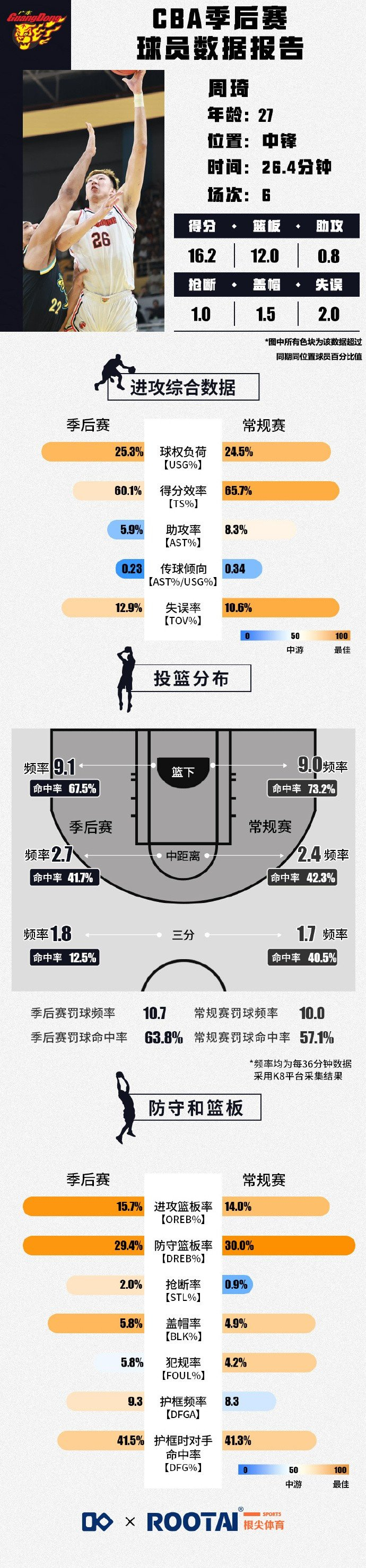直播吧5月13日讯 今日,中国篮协技战术服务平台普罗篮球分析了周琦的季后赛表现: