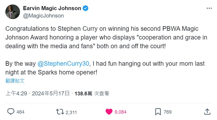 今天,魔术师约翰逊本人在推特上恭喜了库里,他写道:“祝贺库里第二次赢得这个奖项,这个奖项的得主在场上和场下都展现了合作精神与优雅!另外,@斯蒂芬,我昨晚在火花的赛季揭幕战里跟你妈妈玩得很开心。”