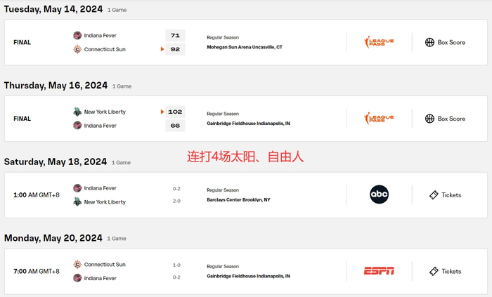 直播吧05月17日讯 WNBA常规赛今天唯一一场较量,印第安纳狂热迎来了主场揭幕战,但由于整体实力差距,最终66-102不敌上赛季亚军纽约自由人。