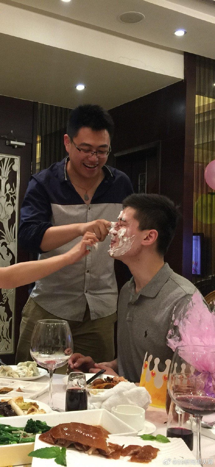 博主@09新闻呢大周晒出阿不都沙拉木庆生被抹蛋糕的照片,配文道:“生日快乐,阿勒泰男人。”