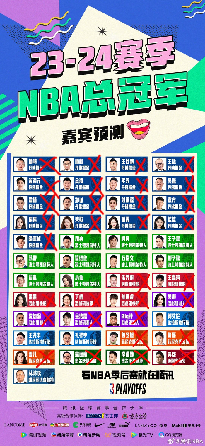 值得一提的是,上赛季鹅厂38位主持人、嘉宾、女主播、名嘴的季后赛预测,仅1人预测正确。
