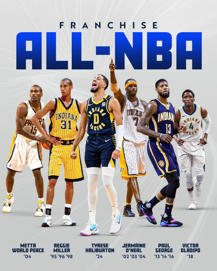 步行者官方晒出数据显示,哈利伯顿是队史第六位入选最佳阵容的球员。另外5人是:雷吉-米勒(95/96/98年)、小奥尼尔(02/03/04年)、阿泰斯特(04年)、保罗-乔治(13/14/16年)、奥拉迪波(18年)。