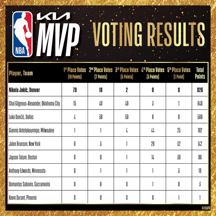 直播吧5月23日讯 NBA官方公布了本赛季最佳阵容,一阵为约基奇、亚历山大、东契奇、字母哥和塔图姆。
