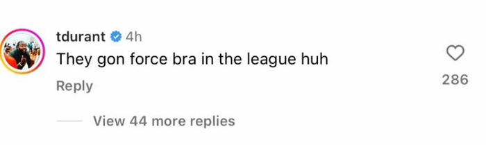《露天看台》INS发布了这一则消息,杜兰特的哥哥Tony Durant在下方评论:“他们要将他硬塞进联盟。”