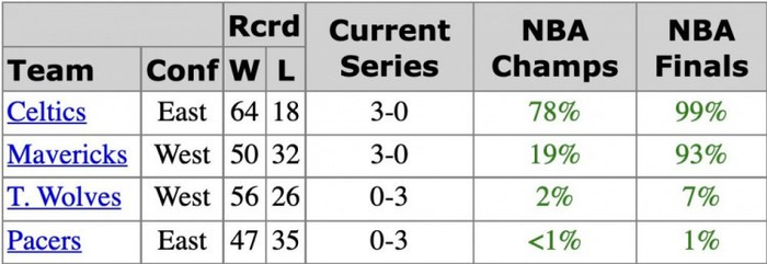 据数据网站测算,在独行侠3-0领先森林狼后,凯尔特人夺冠概率升至78%。