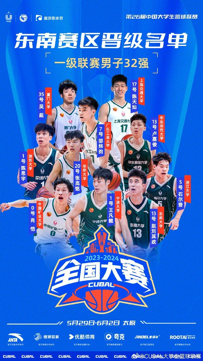 东南赛区,某种意义上可以称之为本届联赛的最强赛区,东南赛区由东南王广东工业大学领衔,共计十支球队从东南来到了全国大赛的舞台。其中更是有两支首次参加分区赛的新军球队最终来到太原。东南大学、厦门大学、浙江大学、华东师大四支队伍在附加赛的征战中均以全胜的战绩成功出线。而镜头转回到备受瞩目的东南王广东工业大学,在面对外界的质疑,球队老大哥退役的情况,真正做到全民皆兵,且视他人之疑目如盏盏鬼火,用实力打破质疑,用信心击碎迷茫,相信经过了东南王的洗礼,这支队伍能够在全国大赛的舞台上再次给我们带来惊喜。而同样是选秀热门王凡懿所坐镇的宁波大学,今年也同样卯足了劲儿能够在全国大赛中取得好成绩。在CUBAL的历史上能够书写出浓墨重彩一笔的华大,今年重整旗鼓,向着他们的“十冠王”发起冲锋。而在东南赛区中给我们带了惊喜与感动的东南大学与深圳大学,两支球队都向我们展示了新军风采,向前冲吧,不论你们走到哪里,你们都在创造历史。全国大赛的序幕明日拉开,精彩与感动常在,明日,我们拭目以待!