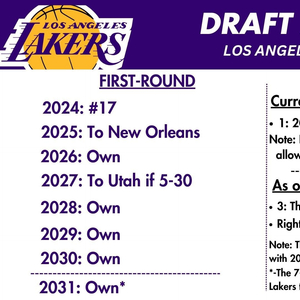 这样一来,湖人在2024年选秀大会上,拥有17号签和55号签。由于只能交易未来7年的选秀权,且不能交易连续两年的首轮签(史泰平规则),湖人目前可以交易的首轮签只有2029年或2030年中的一个。2024年选秀大会结束后,湖人则可以交易3个首轮签(2024年首轮秀、2029年首轮签和2031年首轮签)。