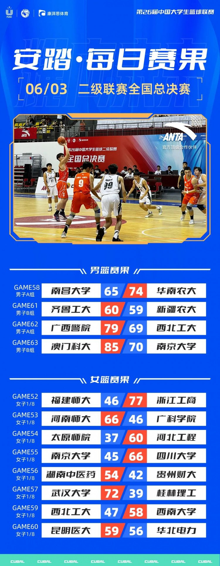 6月3日,第26届中国大学生篮球联赛二级总决赛来到第四个比赛日,男篮打响四强争夺战;齐鲁工大男篮在刘晓伟的两分命中下绝杀新疆农大,挺进全国四强!而以小组第四的澳门科大全员皆兵力克以全胜战绩小组第一出线的南京大学,晋级四强。明日开启半决赛!