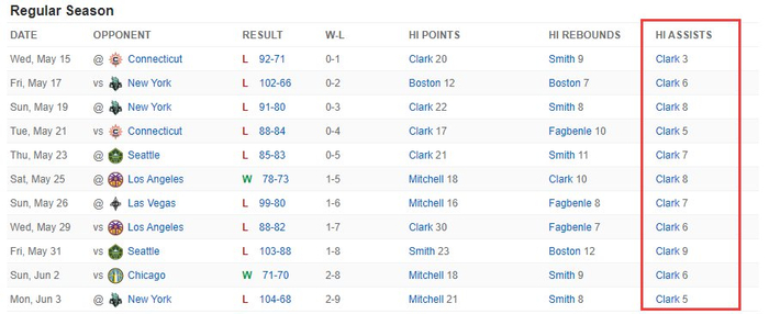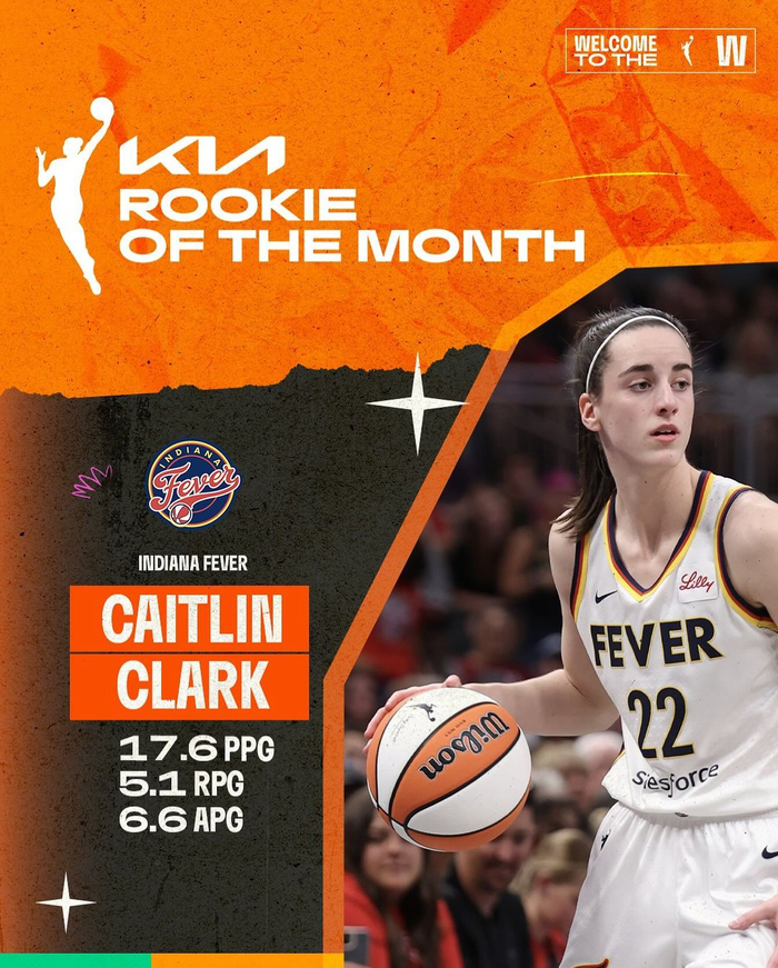 在这个短暂的“间歇期”里,新科状元凯特琳-克拉克以场均17.6分(新秀第1、总排名第13)、5.1篮板(新秀第3)、6.6助攻(新秀第1;总排名第4)、1.2抢断(新秀第3)以及1.1盖帽(新秀第3;总排名第13),成功拿到了上月最佳新秀。并且即便在上一场背靠背惨败自由人,遭遇耳部伤病离场的情况下,她还是送出5次助攻,连续11场比赛都是球队助攻最多或者并列最高的,这也是WNBA历史生涯开局第二长的助攻领跑全队的纪录。