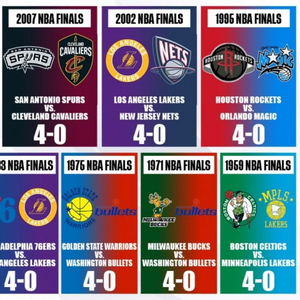 在NBA70余年的历史上,一共出现过9次总决赛横扫。今天老震就为大家盘点一波NBA过往的9次总决赛横扫,看看在总决赛的舞台上有哪些狠角色,又有哪些倒霉蛋。