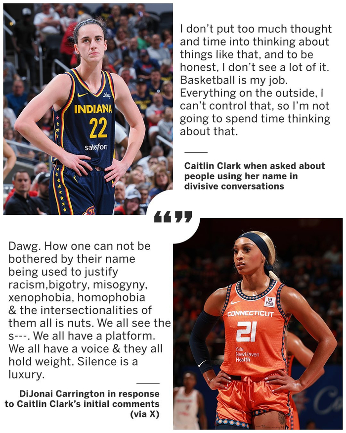 不过这一言论随即引发了康涅狄格太阳球员迪乔娜-卡林顿的不满,她也直接发文吐槽:“朋友,一个人的名字被用来讨论种族主义、偏见、厌女症、仇外心理、同性恋恐惧症以及所有这些乱七八糟的事,怎么会不烦恼呢?我们都看到这些狗屁东西,我也都有一个发声平台,我们都拥有很有分量的话语权。保持沉默太奢侈了。”