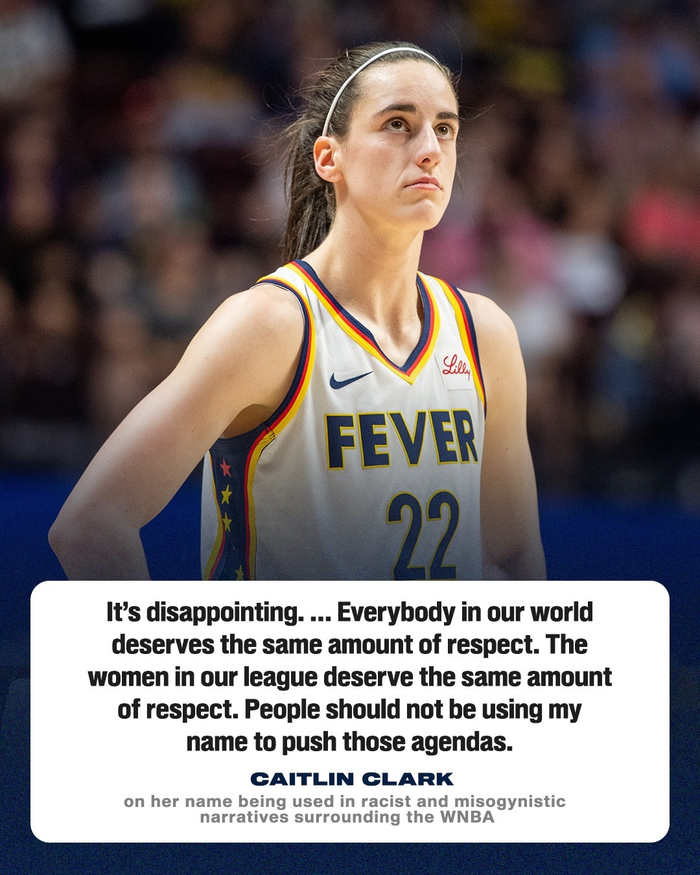 在昨日印第安纳狂热对阵亚特兰大梦想当地时间下午的投篮训练中,克拉克在被问及自己的名字被使用在这些无形的“文化战”中是何种感受时,她谈到:“在这个世界上的所有人,都应该得到同等的尊重。我们联盟中的女性应该得到同等的尊重,人们不应该利用我们的名字,来推进这些议题。