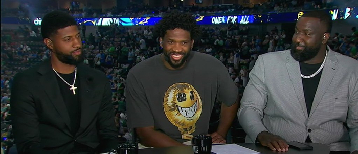 直播吧06月16日讯 昨日NBA总决赛G4,恩比德和乔治作为嘉宾,在现场和帕金斯一起解说了本场比赛。