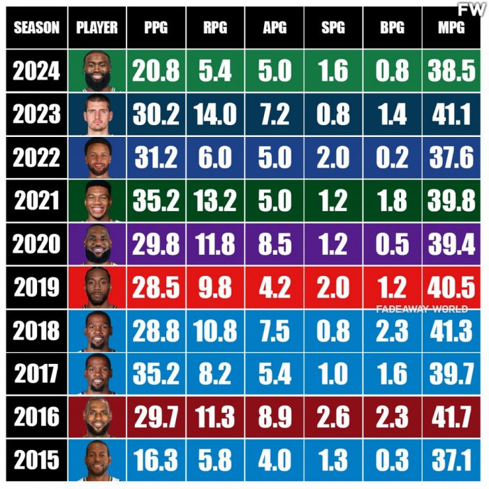 近10年FMVP数据:布朗20.8分第二低&15年一哥16.3分 最高35.2分 NBA综合 2024.06.1908:53 关注 从左到右依次是:得分、篮板、助攻、抢断、盖帽、出场时间【来源:直播吧】
