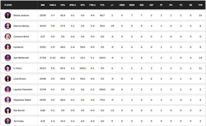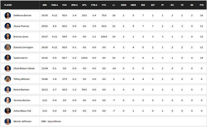 太阳这边,首发五人全部上双,德瓦纳-邦纳(16分;邦纳是历史总得分第5)、泰娅莎-哈里斯(14分)、布里奥娜-琼斯(13分;李月汝今天主要对位者,也是美国奥运女篮阵容预备中锋)、迪乔娜-卡林顿(12分)、艾丽莎-托马斯(11分;WCBA山西外援)
