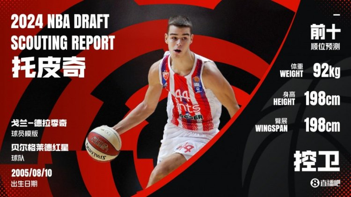 直播吧6月27日讯 2024年NBA选秀大会,雷霆用12号签选择塞尔维亚的尼古拉-托皮奇。