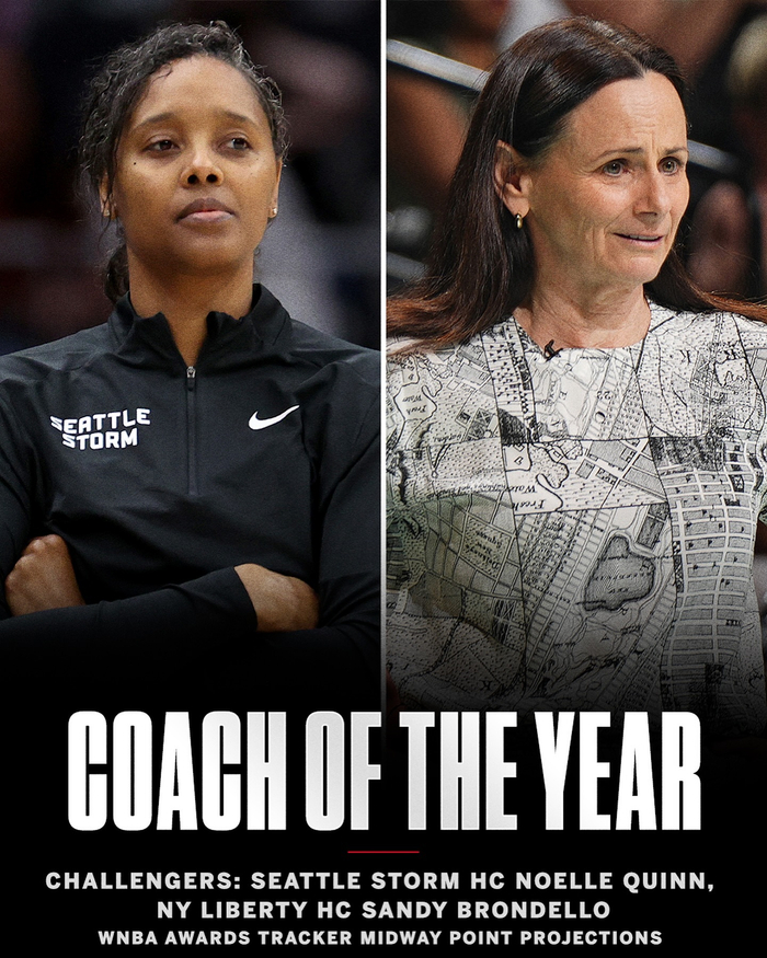 “MVP看起来是阿贾-威尔逊的了。山猫的主帅谢丽尔-里夫可能是年度最佳教练的领跑者,她将一支大多数人在休赛期都没怎么谈论过的球队,带成了冠军争夺者和总裁杯冠军。太阳的迪琼娜-卡灵顿作为一名充满活力的得分后卫以及联盟最佳外线防守者之一,将有很大可能成为进步最快球员。