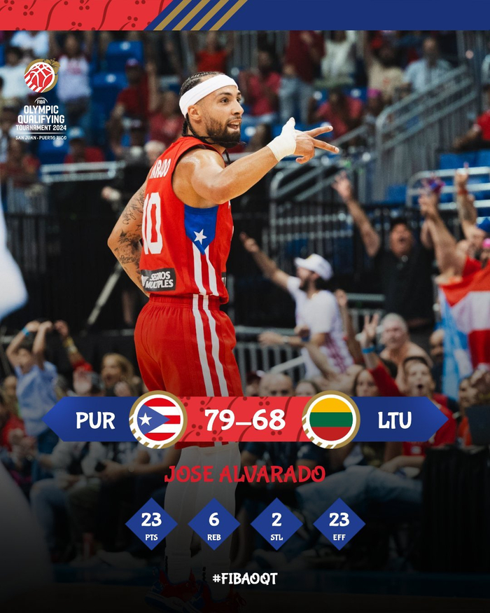此役,阿尔瓦拉多14投9中,三分6中4,罚球1中1,砍下23分6篮板1助攻2抢断,并拿到赛区MVP。巴黎奥运会小组赛中,波多黎各被分在C组,同组对手包括美国、塞尔维亚和南苏丹。